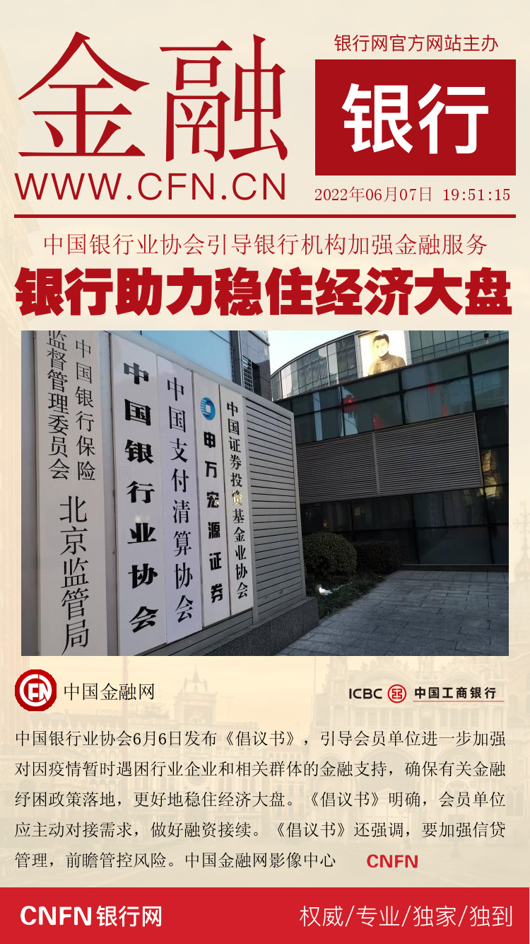 中国银行业协会6月6日发布《倡议书》,引导会员单位进一步加强对因疫情暂时遇困行业企业和相关群体的金融支持,确保有关金融纾困政策落地,更好地稳住经济大盘。《倡议书》明确,会员单位应主动对接需求,做好融资接续。《倡议书》还强调,要加强信贷管理,前瞻管控风险。中国金融网影像中心