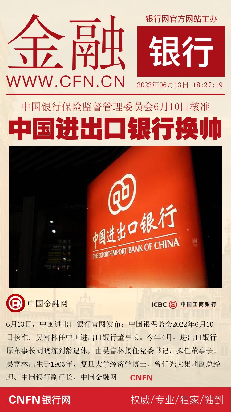 6月13日,中国进出口银行官网发布:中国银保监会2022年6月10日核准:吴富林任中国进出口银行董事长。今年4月,进出口银行原董事长胡晓炼到龄退休,由吴富林接任党委书记,拟任董事长。吴富林出生于1963年,复旦大学经济学博士,曾任光大集团副总经理、中国银行副行长。中国金融网