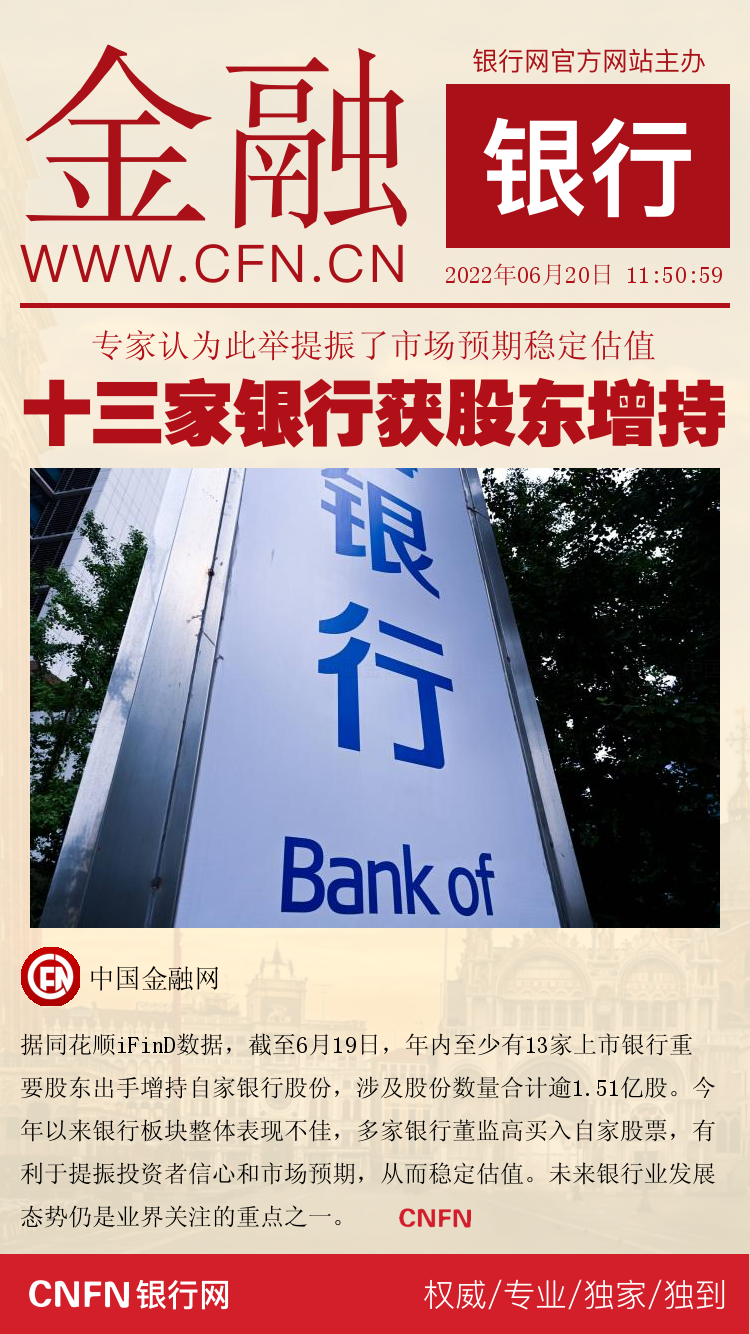 据同花顺iFinD数据,截至6月19日,年内至少有13家上市银行重要股东出手增持自家银行股份,涉及股份数量合计逾1.51亿股。今年以来银行板块整体表现不佳,多家银行董监高买入自家股票,有利于提振投资者信心和市场预期,从而稳定估值。未来银行业发展态势仍是业界关注的重点之一。
