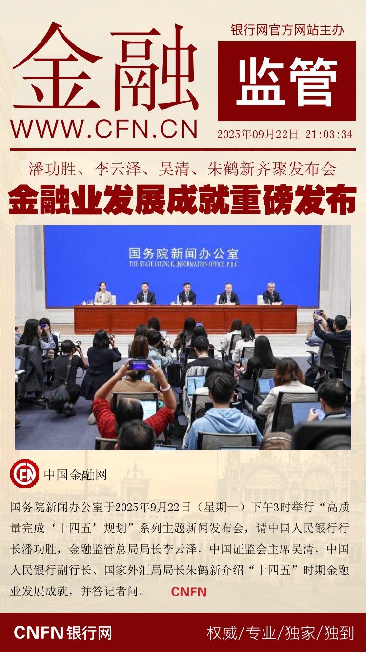 国务院新闻办公室于2025年9月22日(星期一)下午3时举行“高质量完成‘十四五’规划”系列主题新闻发布会,请中国人民银行行长潘功胜,金融监管总局局长李云泽,中国证监会主席吴清,中国人民银行副行长、国家外汇局局长朱鹤新介绍“十四五”时期金融业发展成就,并答记者问。